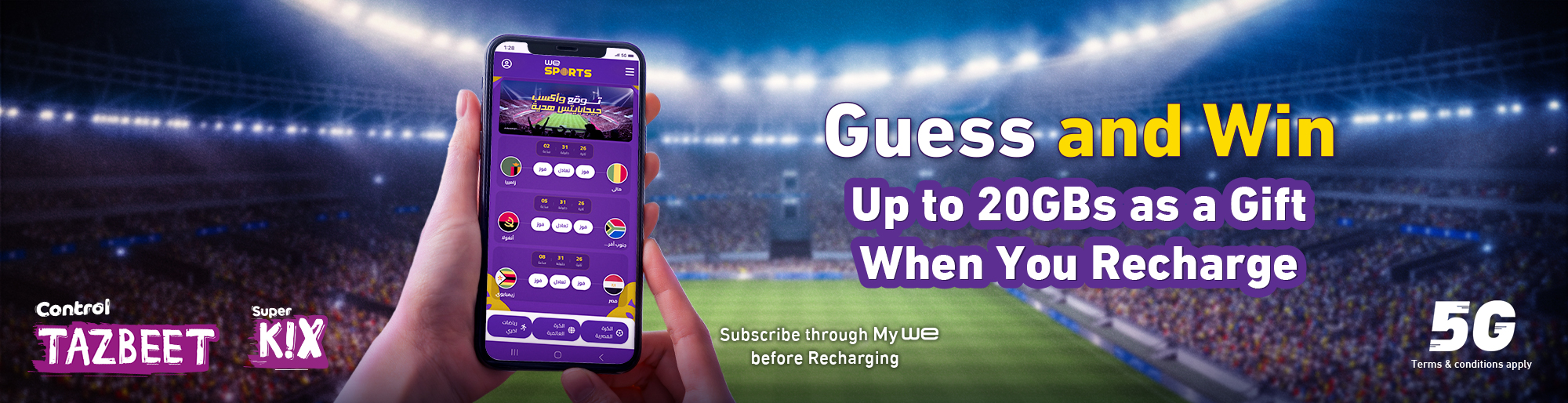 - Subscribe through the My WE App and recharge EGP 10 or more to guess daily tournament matches and earn bonus MBs for every correct guess
